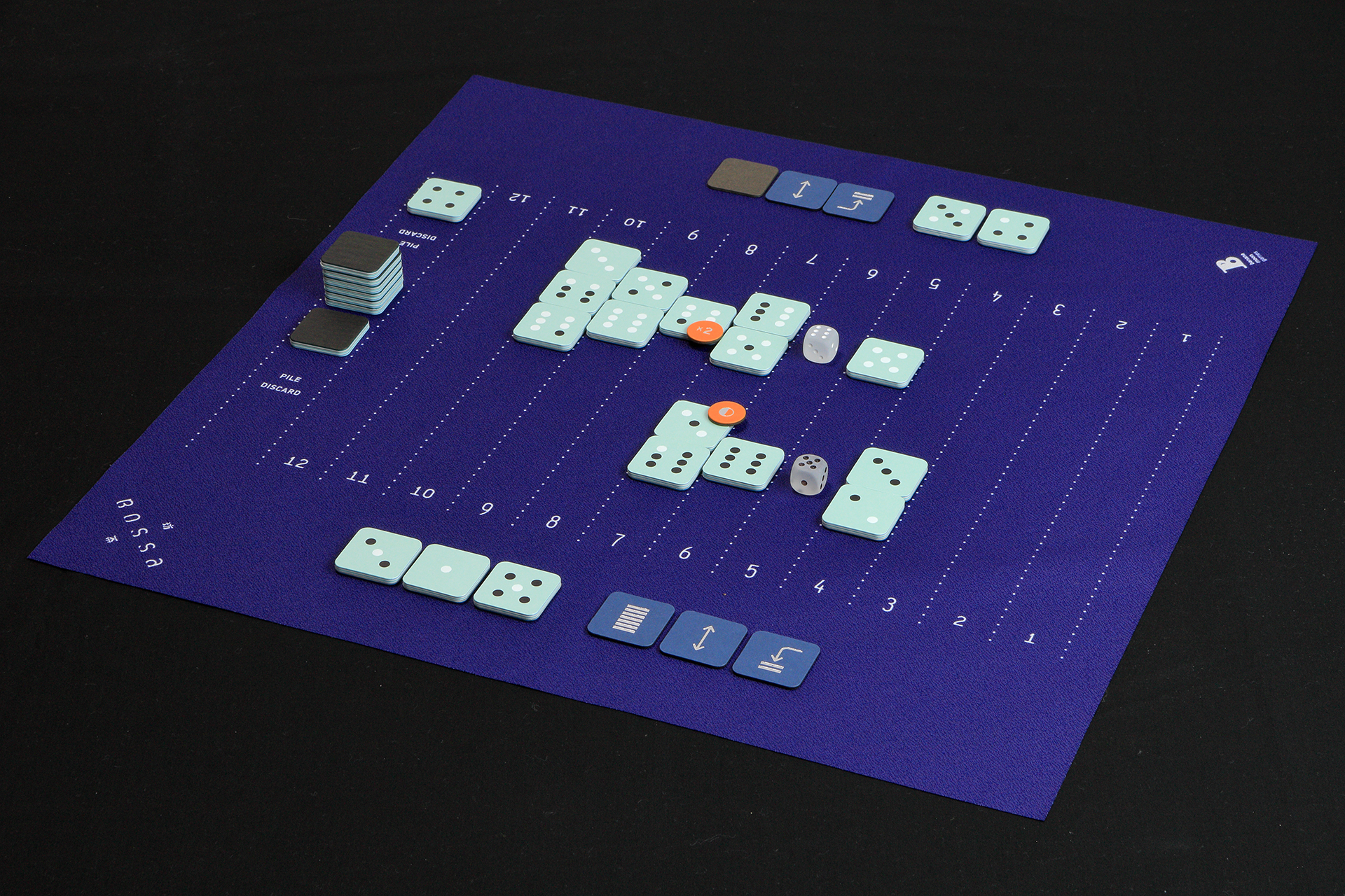 プレイマットの中央部には場の列(1〜12)と山札タイル置き場・捨てタイル置き場がレイアウトされ、各プレイヤーの手前には手札やアクションカード、拡張チップを置くスペースがあります。