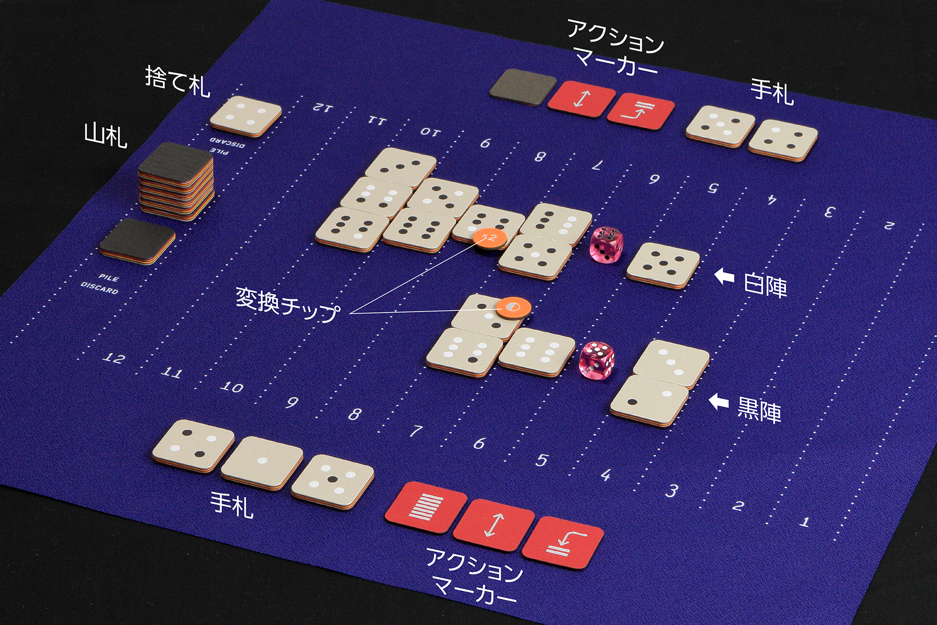 ダイス(サイコロ)とタイルを使い、自陣・敵陣に分かれて対戦する2人ゲームです。