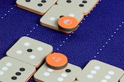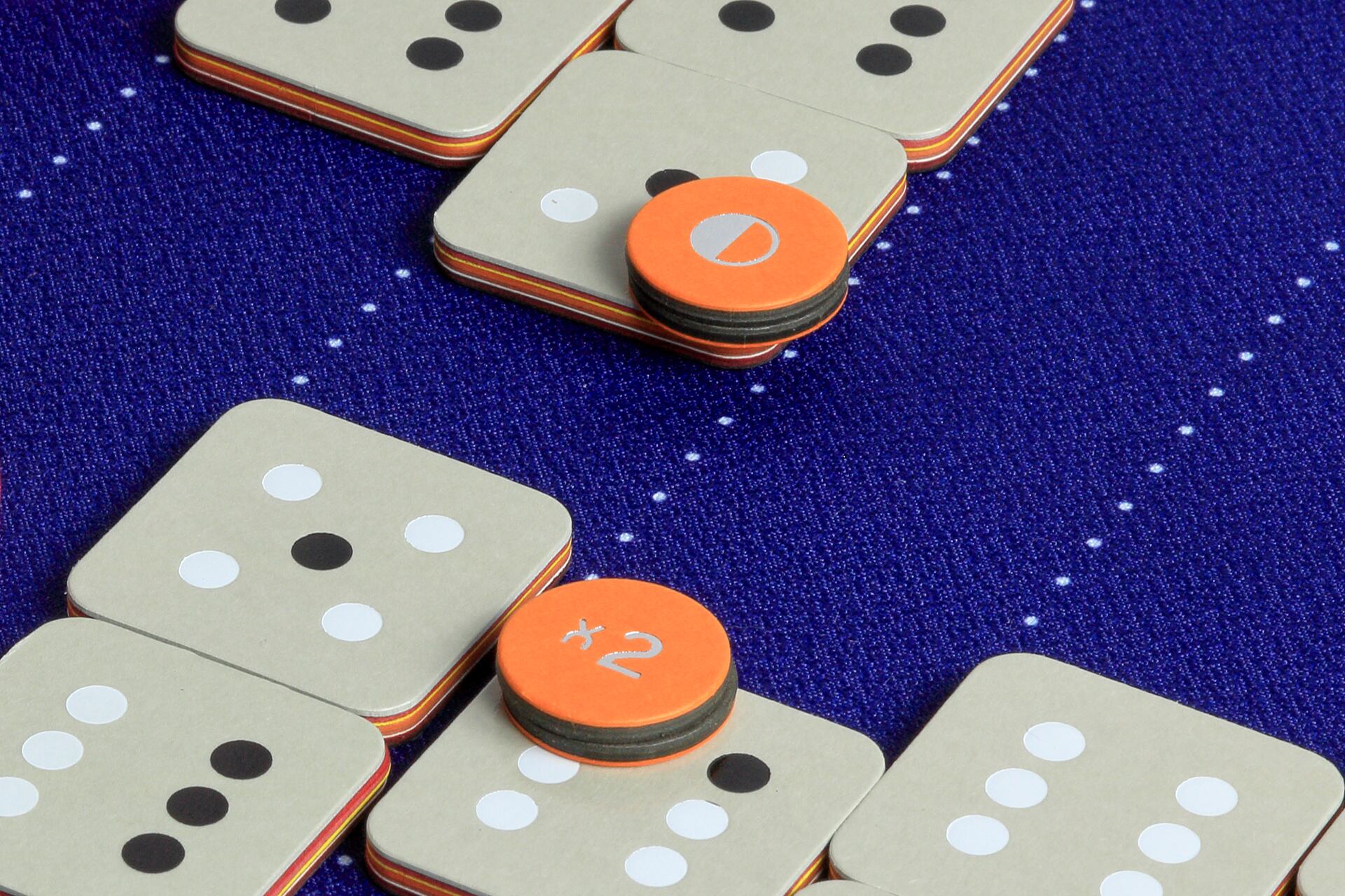 白目・黒目それぞれのダイスを振り合い、出た目の数を起点に、その両隣から同じ色のドットの数がつながるようにタイルを組み合わせて並べていきます。